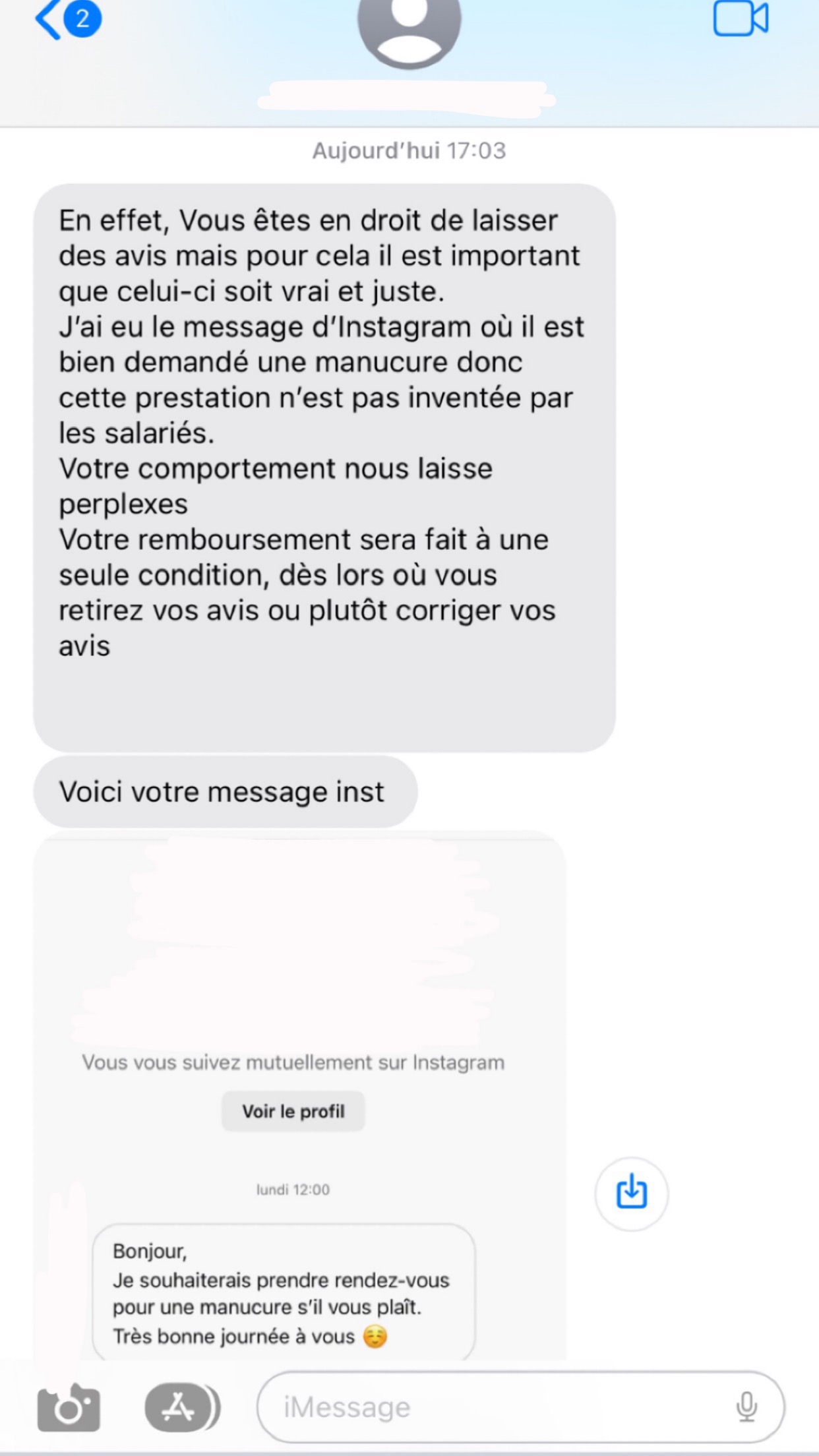 Je me suis faite arnaquer je déconseille ! Vous demandez du semi permanent à 20€ et à la fin on va annonce la couleur à 30€ parce que c’était « express » elles n’étaient même pas d’accord entre elles. Quel honte ! Dans ce cas annoncer la couleur à vos clients avant et pas après ! Pu jamais. J’ai eu la responsable au téléphone qui me confirme qu’elles n’avaient rien compris et aujourd’hui je suis victime d’harcèlement par la responsable elle même qui se permet de m’envoyer a tout va des messages personnels je suis outrée je n’ai pas les mots..